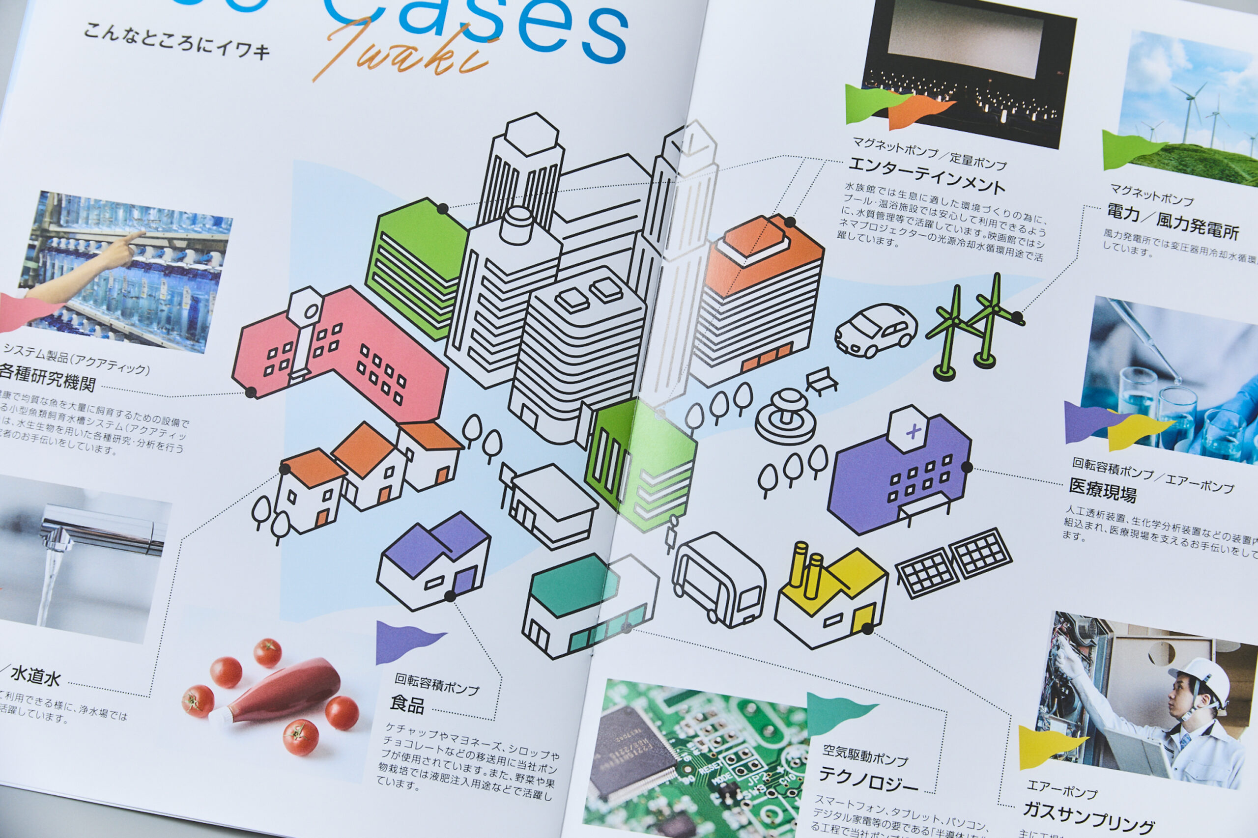 製品ラインナップを色分けして整理し、さらにその活用場所をわかりやすく示すために「こんなところにイワキ」を企画しました。