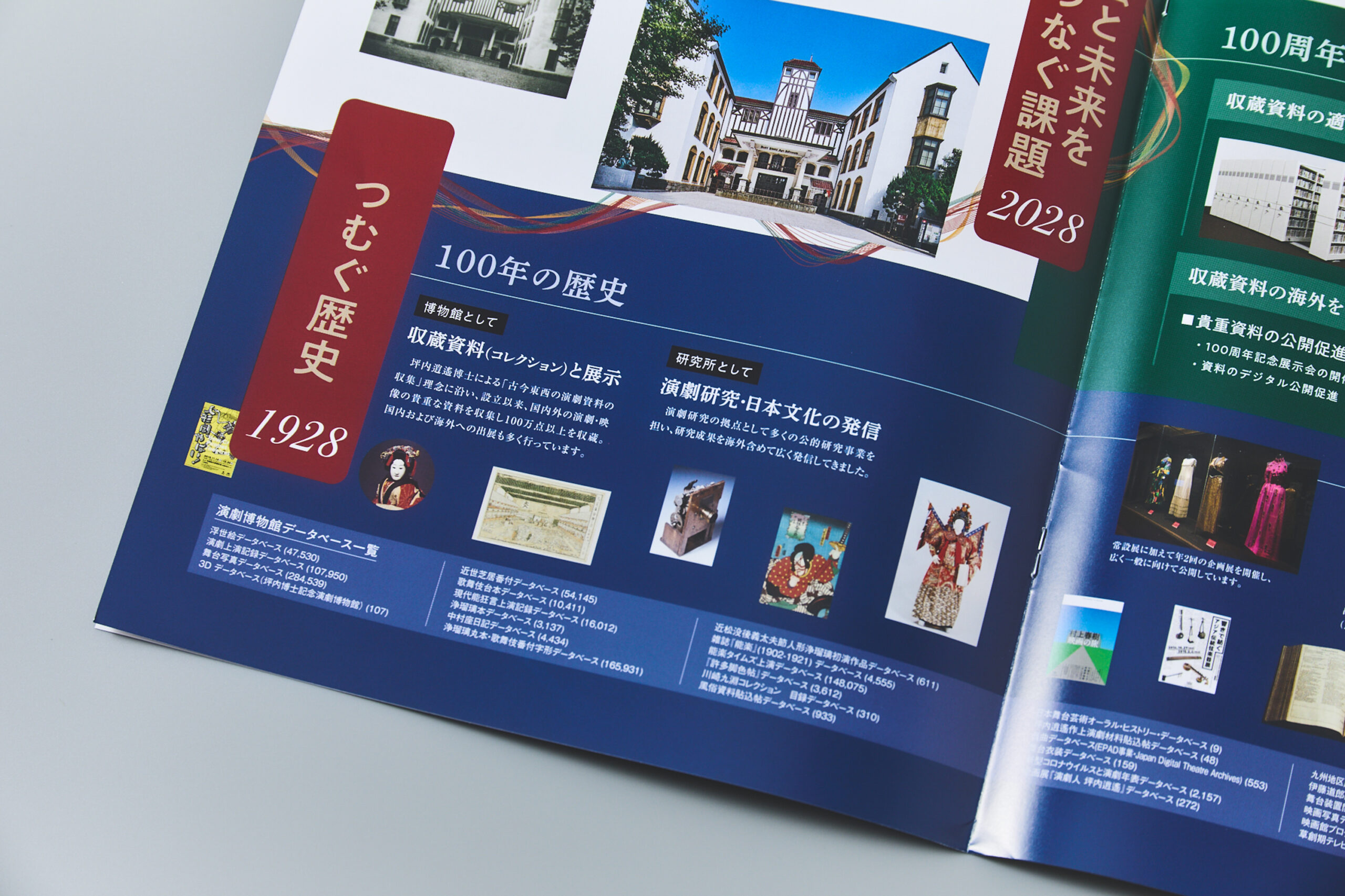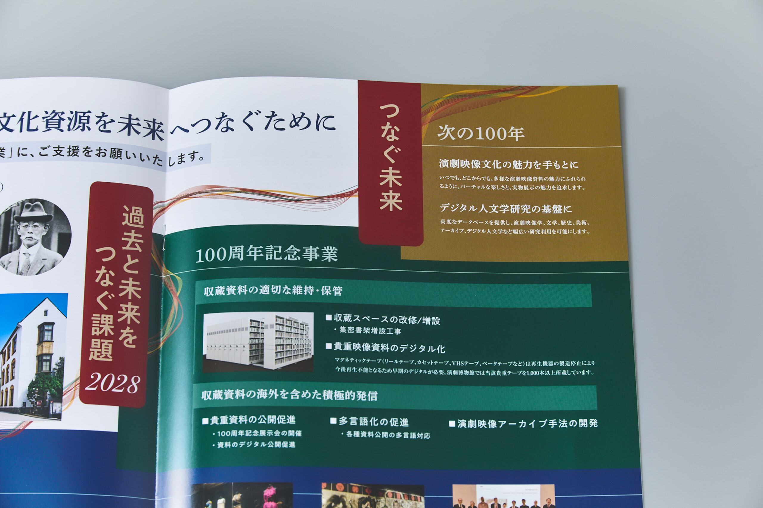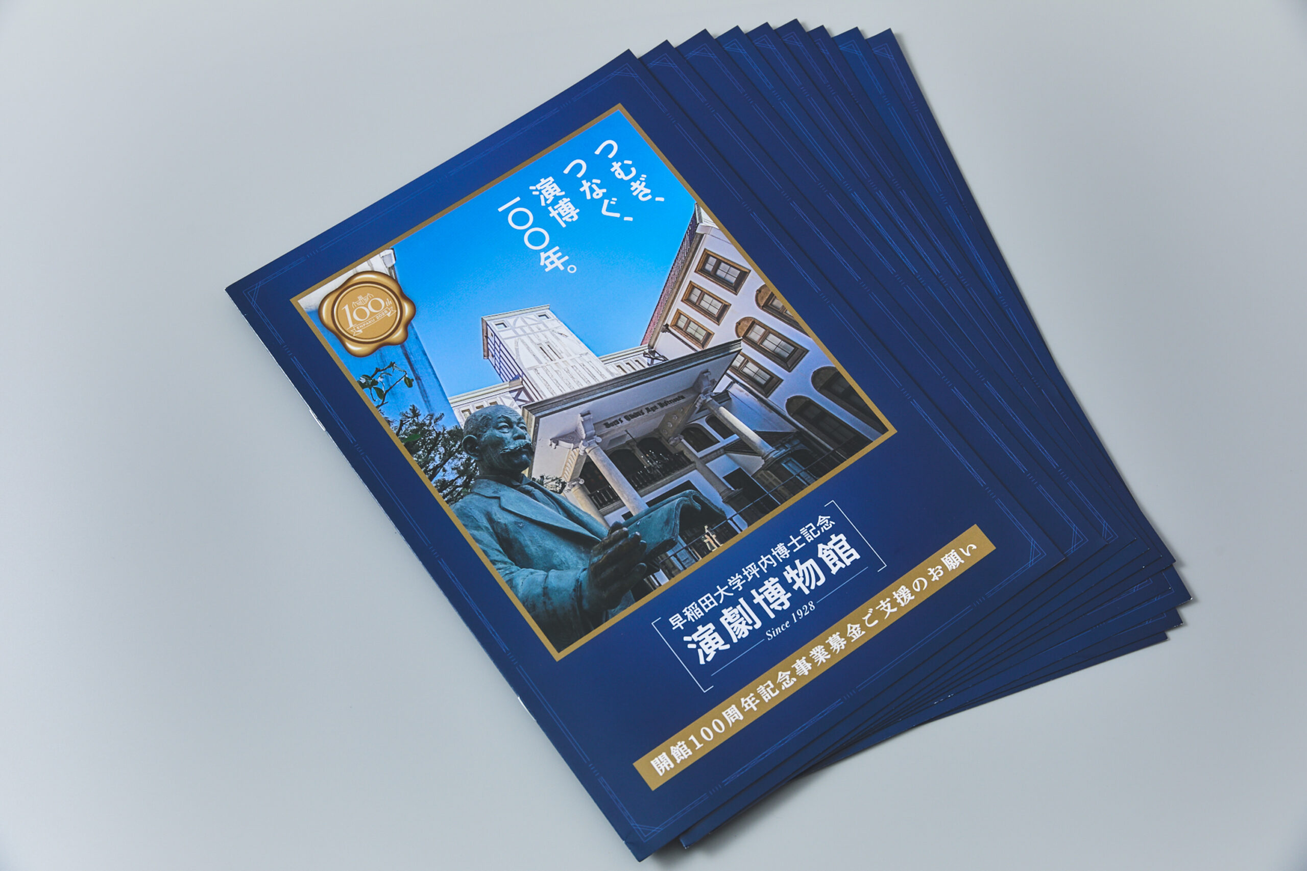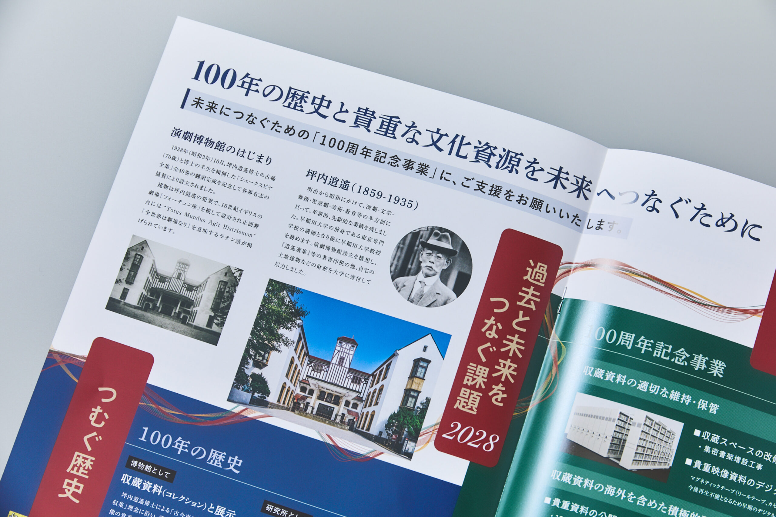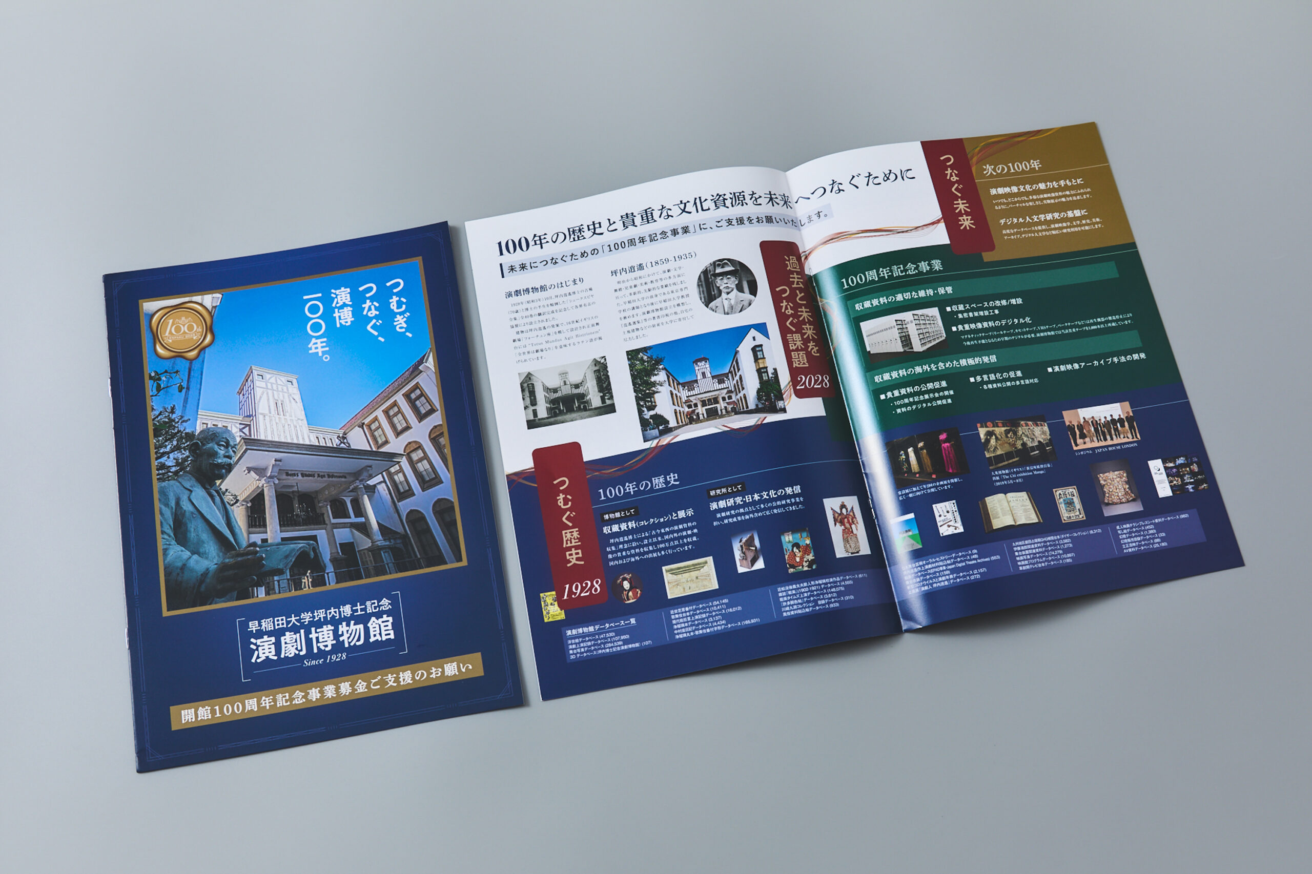 今回のパンフレット制作は、演劇博物館が2028年に創立100周年を迎えるにあたり、次代への取り組みと寄付金について紹介することが目的です。